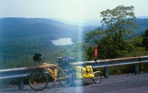After Chambersburg I hit two major hills including Tuscarora Mountain.  Normally I can low gear through a hill, but this eight-percent grade slope kept going on and on, winding to and fro, switch backing left then right.  This was a battle I could not win peddling.  I pushed my bike up the hill and I still had to take breaks.  When I got to the summit a sign said the elevation was about 2100 feet.  All I saw was more road and another mountain.
