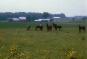 By noon it has stopped raining.  Wisps of dark cloud like hooves of a vest barbarian horde gallop across the hills and woods.  The Lake Erie wind pushes me back south.  I see great brown Belgian horses with blonde manes.  They are almost as large as a Clydesdale.  They have very powerful bearing.  The herd stops what they are doing and check me out.  The matriarch steps out from the herd to get a better impression of me.  I try my best to let them know they are beautiful and awesome creatures, but I believe they somewhat perplexed by my bike, with its bright yellow trailer and flag, gears clicking and shifting, and my wet cleats squeaking: what manner of beast has flesh and metal, has the upper body of a man, the buttocks of a sow, and the tail of a peacock?